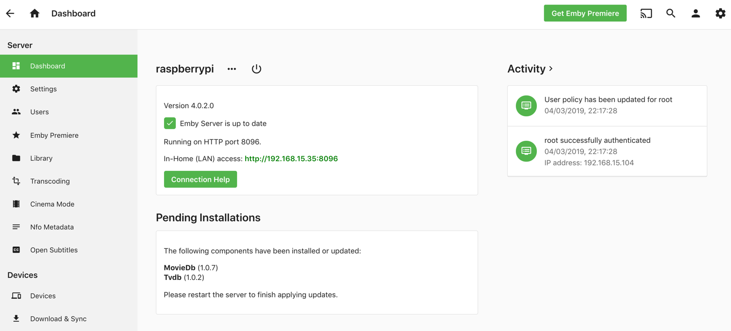- Browse to Emby interface on http://[pi-static-ip]:8096 and step through the wizard