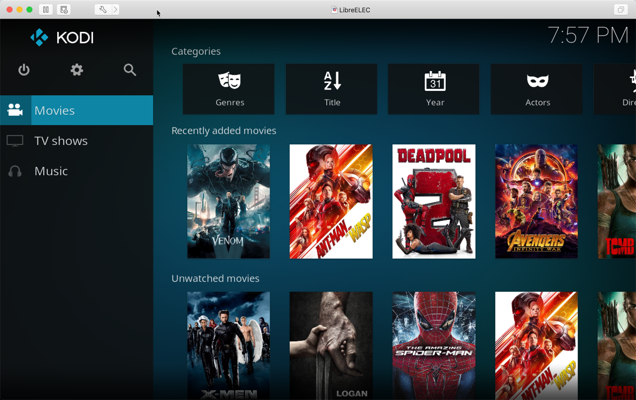 You should also now see media in your Kodi Client. I’m a Superhero fan so I mocked up some dummy movies by touching some filenames, but presumably you will have the real thing.