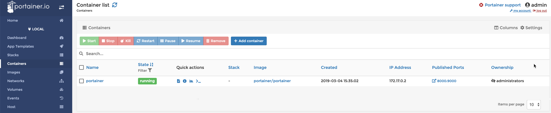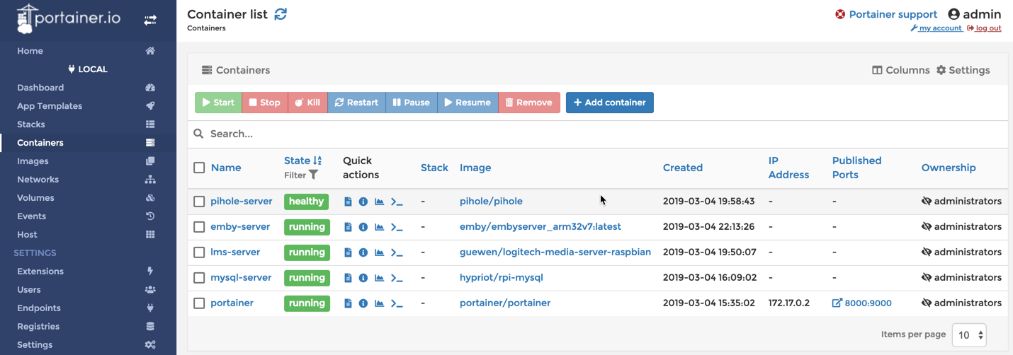 If you’ve not used it, try it. It’s a really cool management UI interface for docker. Allows you to edit/manipulate containers/images as well as view logs and access the console of containers, on both local and remote docker hosts! By default it uses port 9000, which is also used by LMS (and which I install later) so I’m mapping port 8000 on the host to port 9000 inside the container