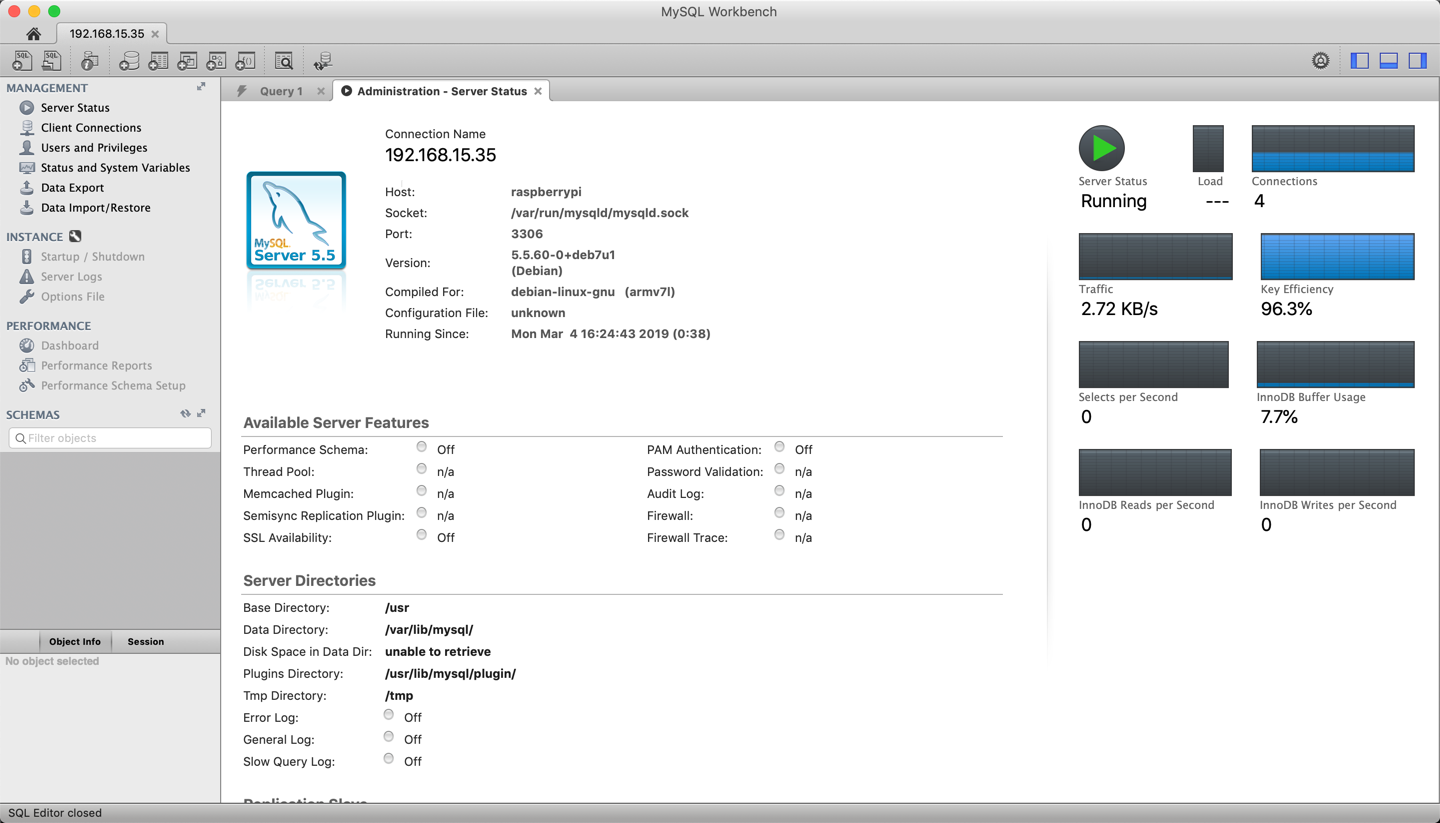 You should now have a MySQL server ready for Kodi. You can try accessing it via a MySQL client. Here it is via MySQLWorkbench. No databases/schemas are present. They’ll be created later by the first Kodi client to hit the server.