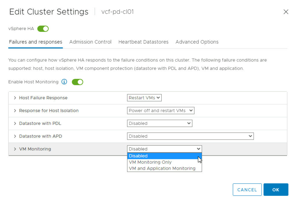 One thing that used to frustrate me no end was that my VCF ESXi upgrades (especially from ESXi 6.7 to ESXi 7.0) would regularly fail. At first I thought it was something inherent to the spec of the nested VM, or that nested VMs were just not well suited to the use case, but after endless digging and exploration I found my culprit. A simple setting in vSphere HA was causing the Nested Hosts to reset during the ESXi upgrade process!