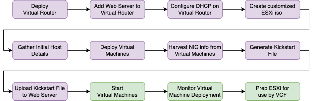 In Part 1 of this post I covered setup of the environment, creating the nested host VMs themselves and configuring kickstart. Basically we did everything in purple in this workflow. In this post I’ll cover the last three steps required to get these nested hosts deloyed and prepped for VMware Cloud Foundation (VCF) bringup or VI workload domain creation. (Note: I revised Part 1 of this series, so check back if you read the original version).