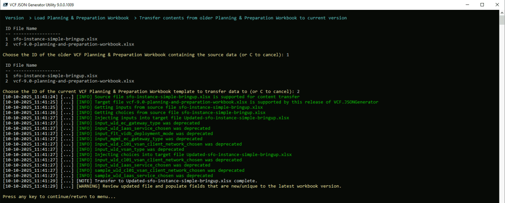 Here we see us attempting (and failing) to load the file we had been working on (in the older version of Planning & Preparation workbook) named sfo-instance-simple-bringup.xlsx